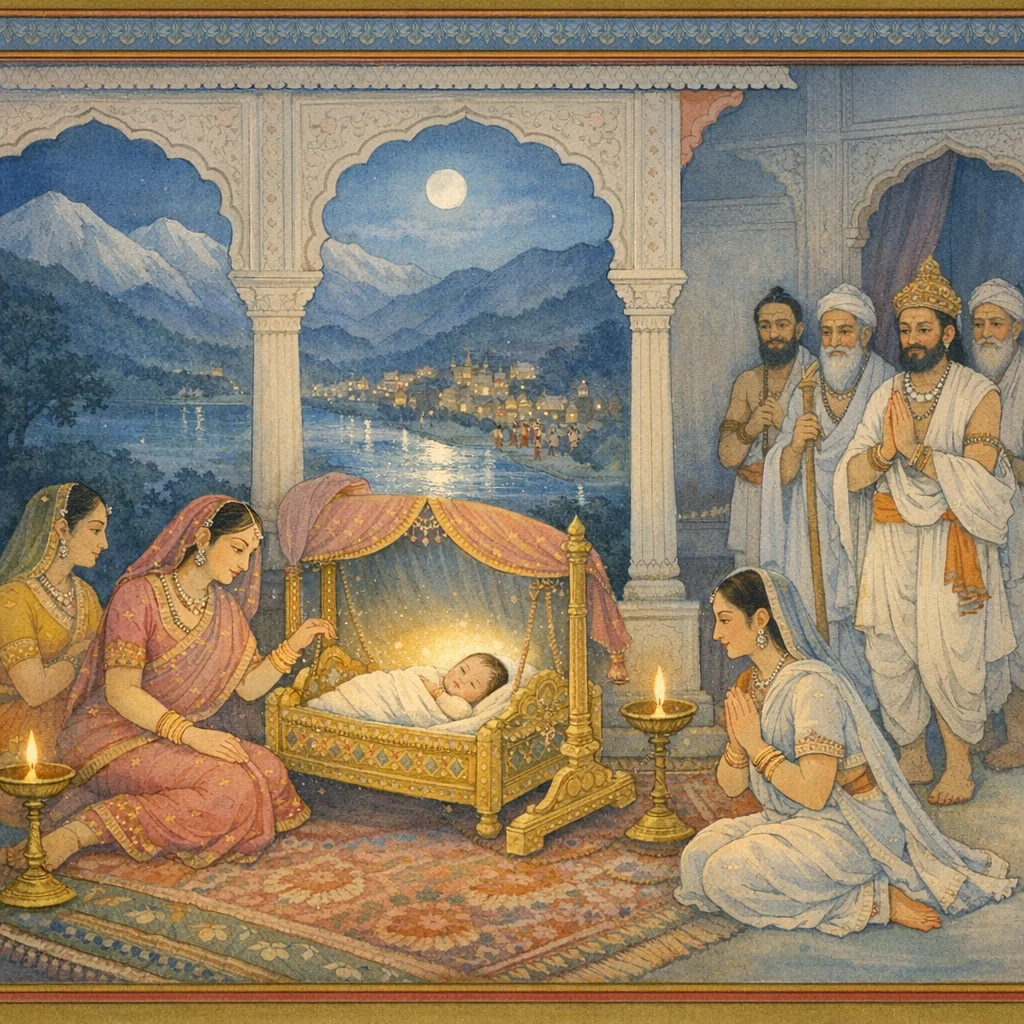 Adhyāya 7 schildert die unmittelbaren Umstände und die sozial‑rituelle Reaktion auf Pārvatīs Geburt im Hause Himālaya und Menā. Brahmā berichtet von Menās sichtbar weltlicher Mutterregung und ihrem Weinen nach der Geburt; zugleich wird die Palastnacht mit veränderter Leuchtkraft beschrieben, als Zeichen eines liminalen, glückverheißenden Augenblicks. Beim Schrei des Neugeborenen eilen die Frauen des Haushalts liebevoll herbei; Diener melden dem König rasch, die Geburt sei auspicious, freudenspendend und dazu bestimmt, göttliche Aufgaben zu vollbringen (devakāryakara). Himālaya kommt mit seinem Purohita und gelehrten Brāhmaṇas, erblickt die strahlende Tochter und jubelt über ihre außergewöhnliche Schönheit, verglichen mit dem Farbton eines blauen Lotusblattes. Es folgt ein öffentliches Fest: Männer und Frauen der Stadt freuen sich, Instrumente erklingen, glückverheißende Lieder und Tänze werden dargeboten; der König vollzieht die Jātakarma‑Riten und schenkt Dāna an die Dvijas. So erscheint Pārvatīs Ankunft als häusliches Ereignis und zugleich als kosmisches Zeichen heiliger Bestimmung.