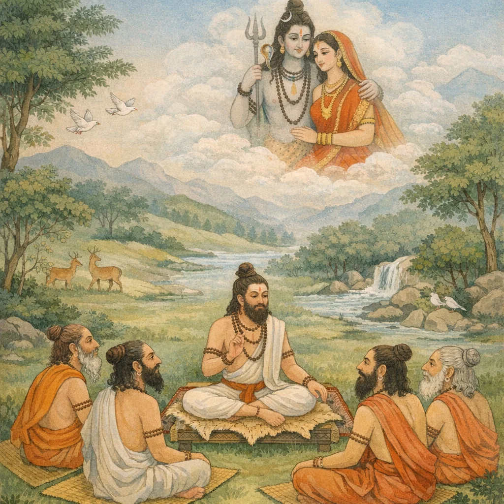 Umgeben von Munis, seinen Schülern — wie die Veda von den heiligen Śāstras umschlossen — saß dort Upamanyu von großem Glanz: still, friedvoll und ganz in die Meditation über Śiva versunken.