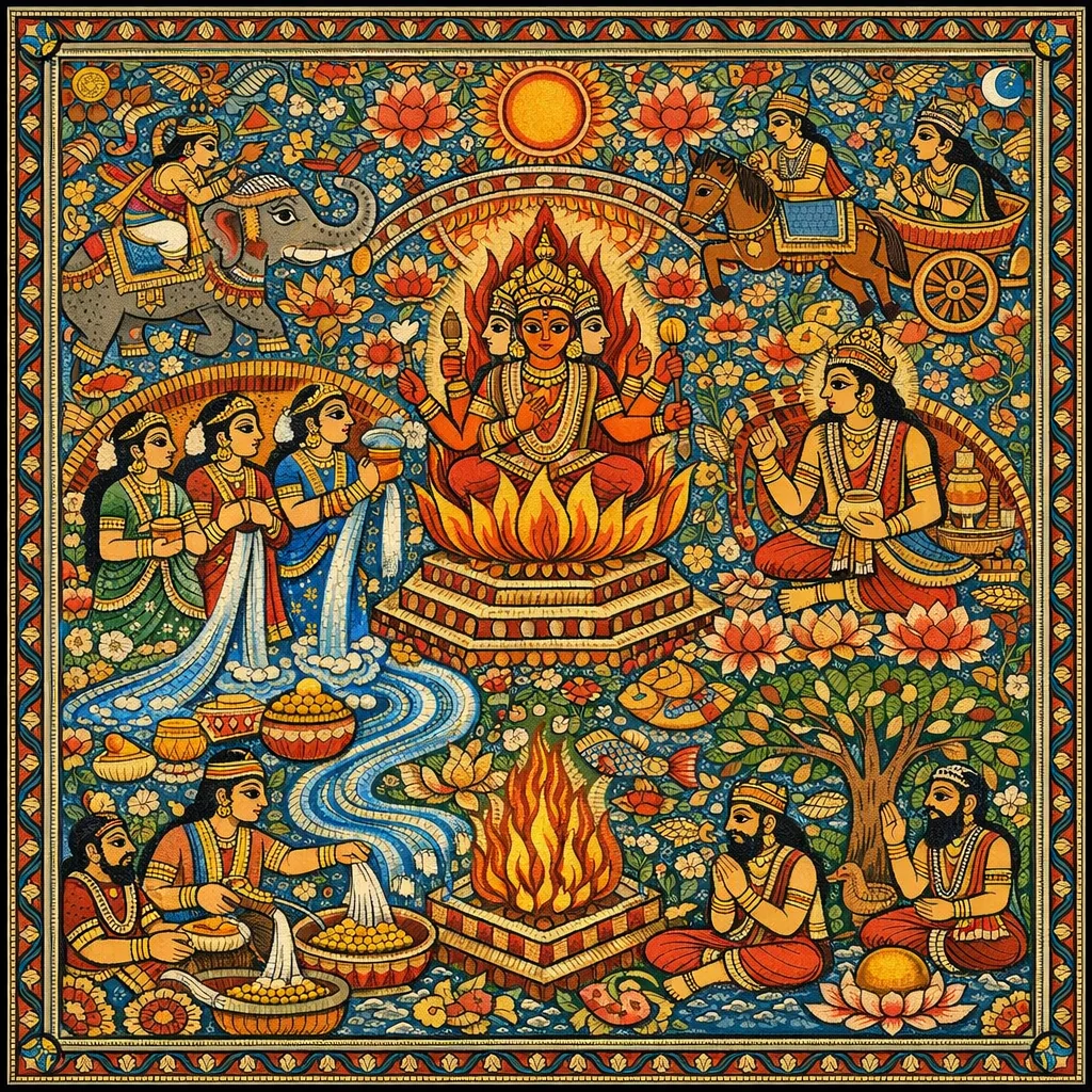 Adhyāya 17 setzt den Vasordhārā‑Strom und verwandte Feuerriten fort und verwendet Wohlstands‑Yajus, um Fülle zu sichern, während die Darbringung im Einklang mit der kosmischen Ordnung bleibt. Ein kraftvoller Agni‑Zyklus (Pāvaka, Devavāhana) rahmt den Ritus: Agni wird von all seinen Sitzen herbeigerufen, zum Schutz gemacht und beauftragt, Götter und Opfernden emporzutragen. Damit verflochten sind kosmogonische Befragungen im Stil von Viśvakarman/Prajāpati — nach der ersten Stütze, dem uranfänglichen „Holz/Baum“ und dem von den Wassern getragenen „Keim“ —, sodass die rituelle Handlung als Wiederaufführung der Schöpfung erinnert wird. Das Kapitel kulminiert in pragmatischen Erhöhungen von Rang und Wohlergehen (einen Menschen erheben, hinaufführen) und zeigt, wie metaphysische Einsicht und materieller Wohlstand rituell verbunden werden.