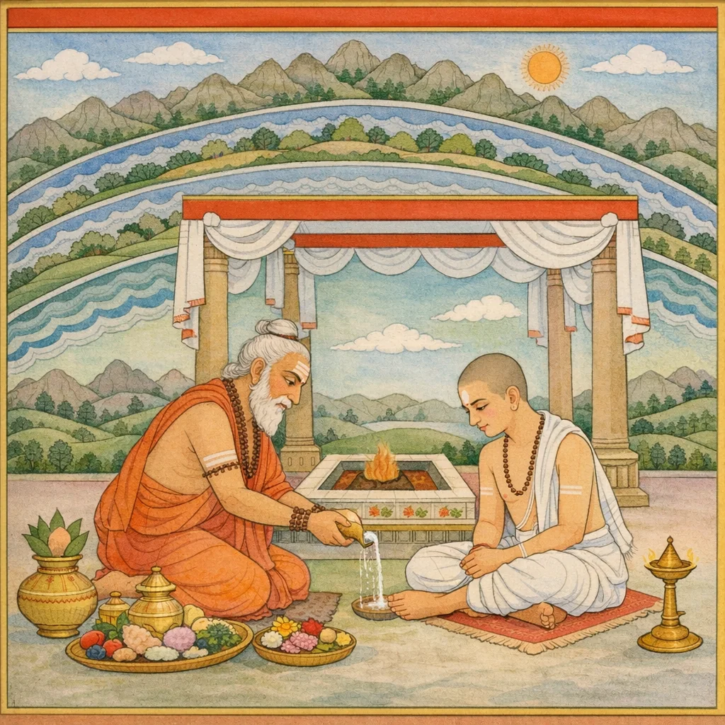 Mantra: „Durch Viṣṇus Gnade bist du zur Vollendung gelangt; die Dīkṣā ist empfangen, samt dem Kamandalu. Nimm es mit beiden Händen: Nun bist du tauglich für Ritus und Übung—für Handlung und Vollzug.“