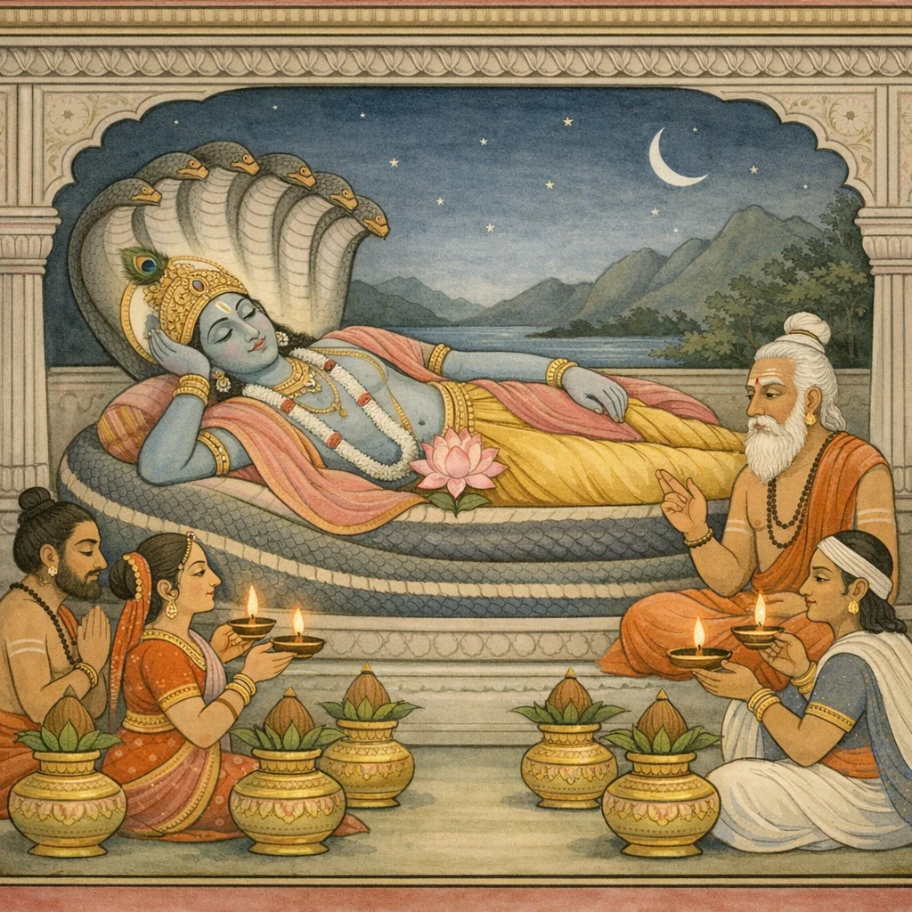 „O Bester unter den Königen, in dieser Anordnung werden vier Ozeane vorgestellt. In ihrer Mitte soll man, gemäß dem zuvor vorgeschriebenen Verfahren, Hari aus Gold einsetzen — den Herrn der Yogins, der im yogischen Schlaf verweilt und gelbe Gewänder trägt.“