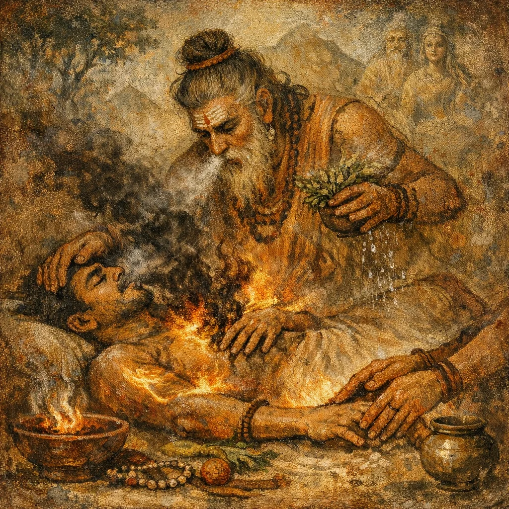 Plants (vanaspati) are invoked as living medicines, and mountains symbolize the strong source-place of herbs and firm vitality. Together they represent concentrated natural healing power assisting the mantra’s expulsion of disease.
