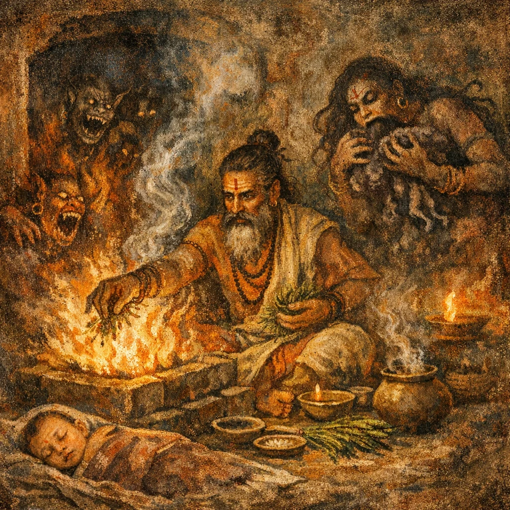 It addresses witchcraft-like harm: curses, stupefying spells, and attacks that drain a newborn/child’s vitality. The hymn’s strategy is to repel and ‘burn back’ the hostile force and make the harm return to its sender.