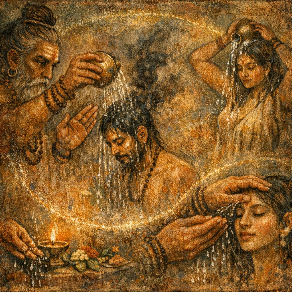 Recite the hymn over a vessel of clean water, then sprinkle the doorway and living space or wash the face and hands with it while intending purification and calm. If someone is unwell, gently sprinkle the head and limbs or use it for a bath.