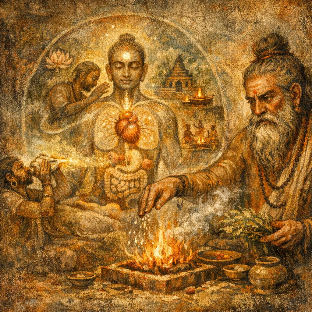 It is a ritual-physiological image: the person is treated as something that can come ‘loose’ in crisis, and mantra plus gesture symbolically re-bind the vital centers so life-force stays integrated.
