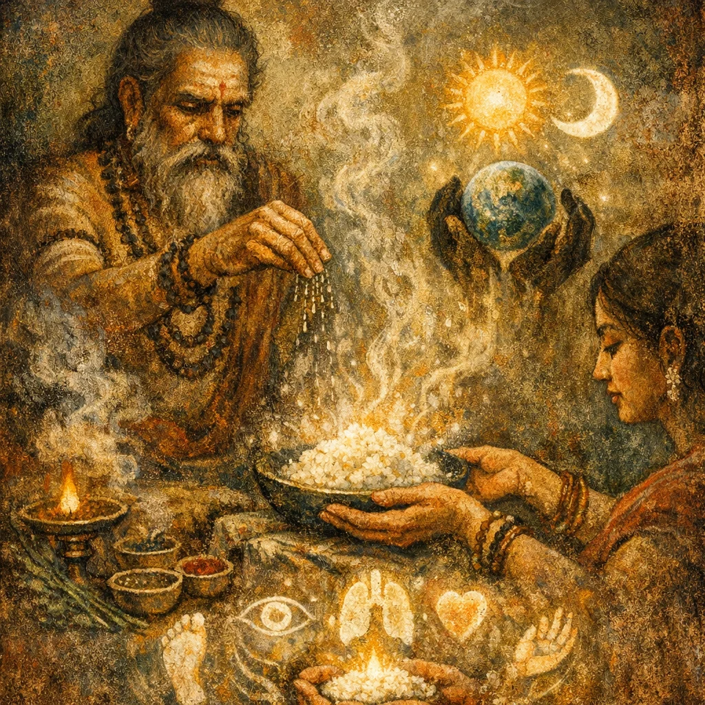 With boiled rice, with sacrificial speech, all the worlds are to be won entire.