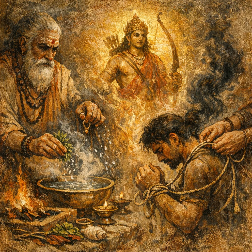 The hymn treats pāśa (“noose/bond”) as the mechanism of divine restraint: the offender is to be seized, restricted, and made unable to continue aggression, with wasting-away as the consequence of guilt.