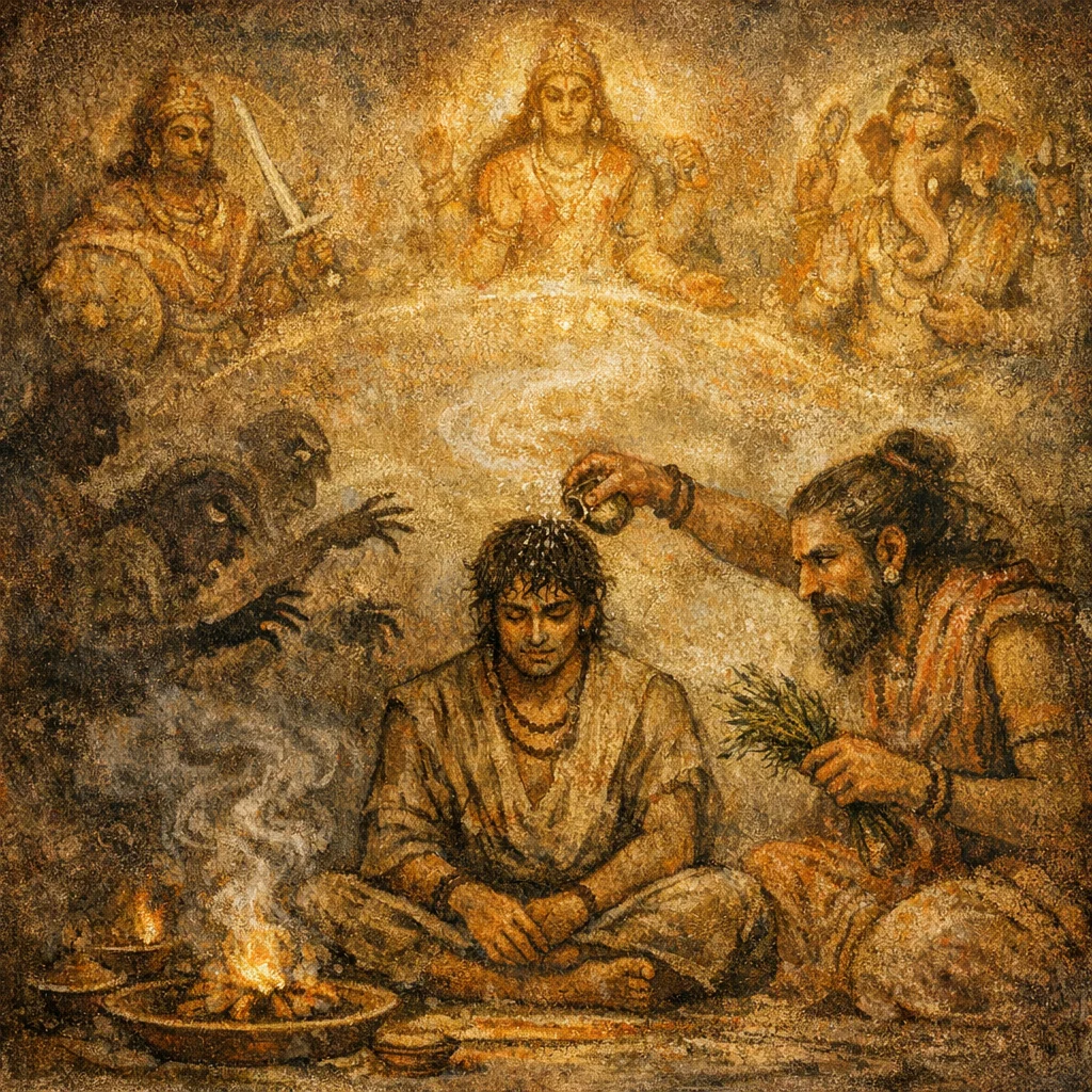 In Vedic ritual space the East is the quarter of beginnings and rightful emergence; moving “following the East” symbolizes correct orientation, legitimacy, and the start of sanctioned progress.