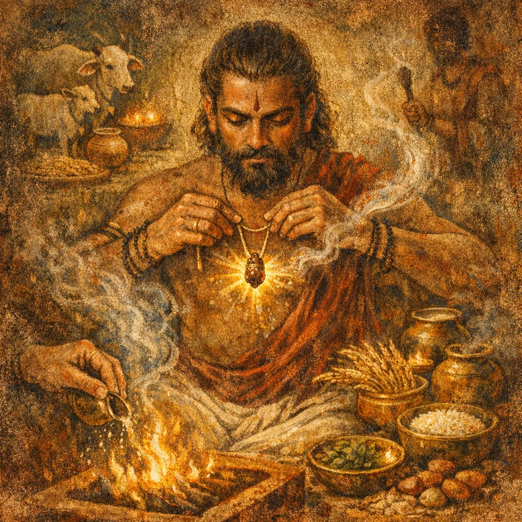 Audumbara is treated as a potent prosperity-substance; fashioned into a maṇi, it becomes a ‘divine’ charm that can fasten abundance (cattle and food) so it remains secure and not easily lost.
