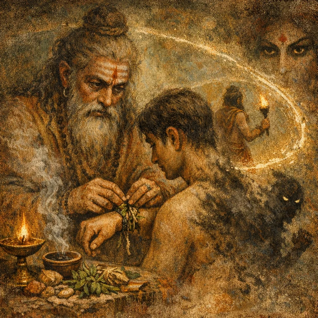 It is aimed at removing hostile influences such as viṣkandha-type affliction and the ‘evil eye’ (harmful gaze/attention). It also functions preventively by building an all-around protective enclosure across realms and directions.