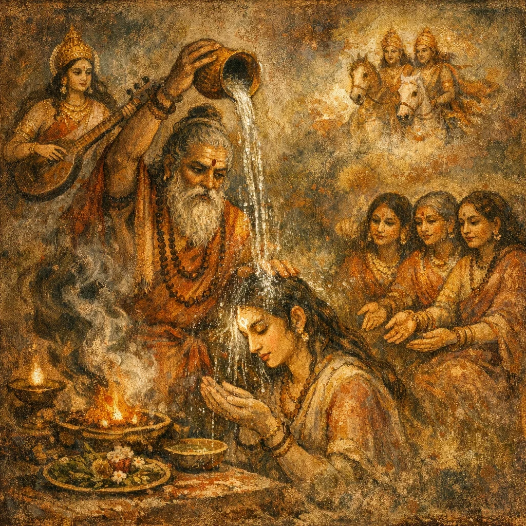 Sarasvatī represents the flow of inspired speech and intelligence, while the Viśve Devāḥ represent collective divine assent; together they support Bṛhaspati’s act of re-ordering and reintegration.