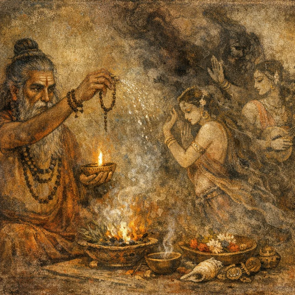 At liminal times (twilight/night), during stormy/astral disturbances, or when there are signs of uncanny agitation—bad dreams, sudden fear, household unrest—attributed to Gandharva–Apsaras influence.