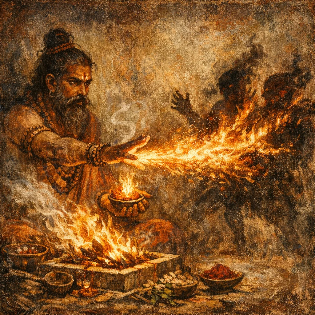 Agni is the visible, immediate power of fire; the hymn treats his flame and heat as an executable force that can burn, scorch, and neutralize an enemy’s potency.