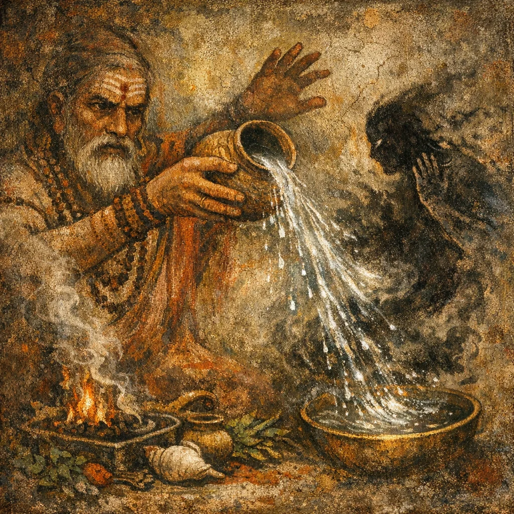 In Atharvanic thought, water is not only cleansing; it can carry an inner heat/radiance (arciṣ/tejas) that acts as an active protective and retaliatory power when ritually addressed.