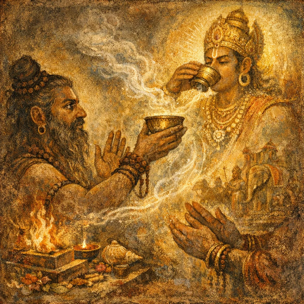 Soma is the classic source of Indra’s increase in power; the hymn says that imperishable, prize-winning splendours gather to him after Soma, implying that such durable glory can flow to the patron through correct praise and offering.