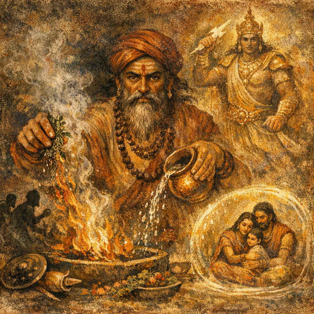 In this short RV-derived set, Sūrya clears away harm through light and forward motion, while Indra is invoked as the beneficent ally who ‘yields’ prosperity and, when strengthened by Soma, stabilizes protection and success.