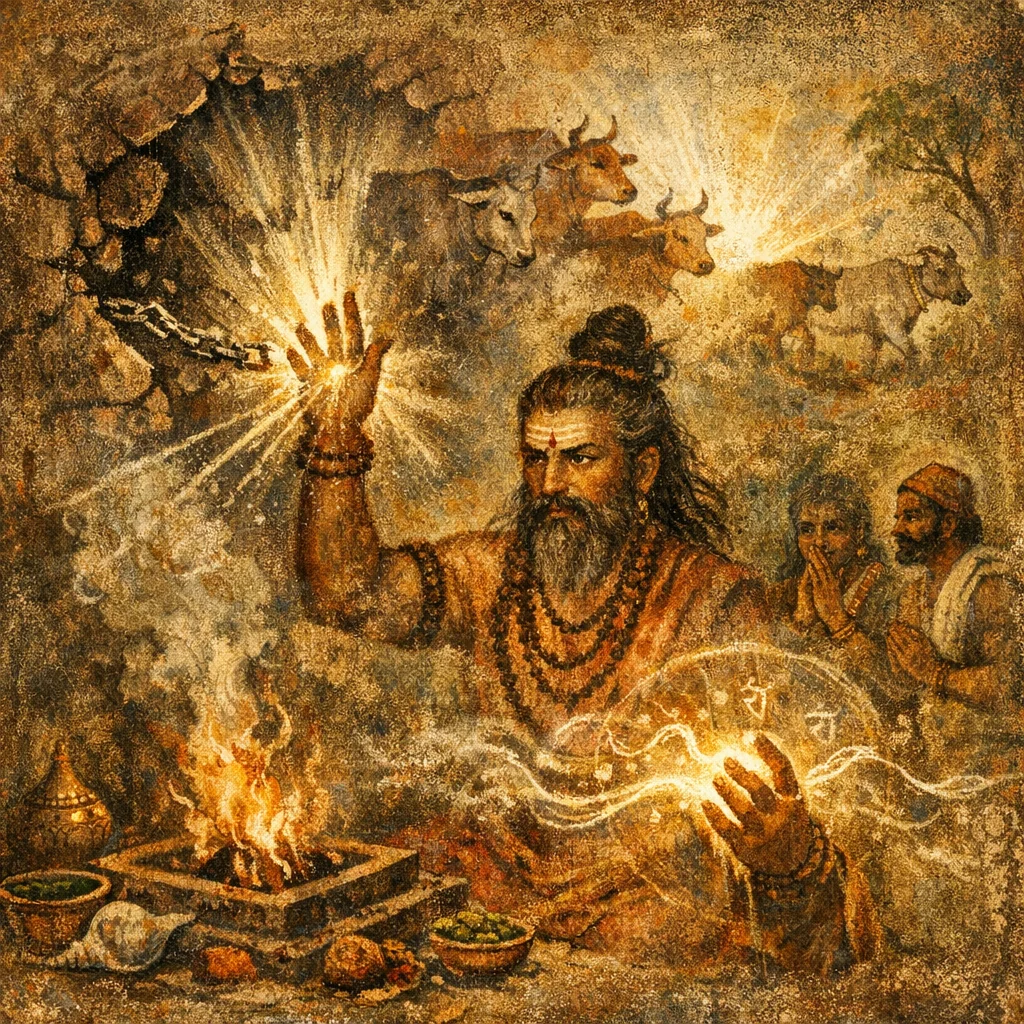 These are symbolic victory-images: rivers represent released life-flow and prosperity; cows represent recoverable wealth; Vṛtra/Vala/Paṇi represent forces that withhold, obstruct, or attack.
