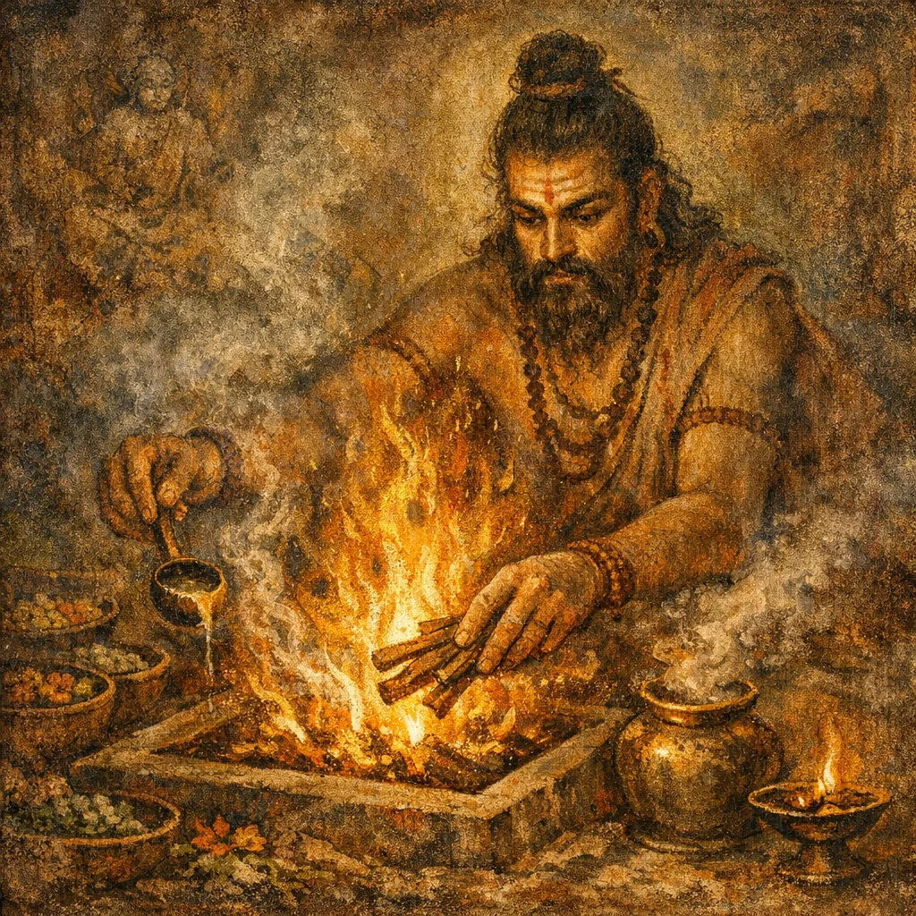 Light a small clean flame (lamp or fire), add fuel steadily, and recite the three verses with the intention of clearing confusion and inauspiciousness; optionally offer a little ghee if performing a formal fire offering.
