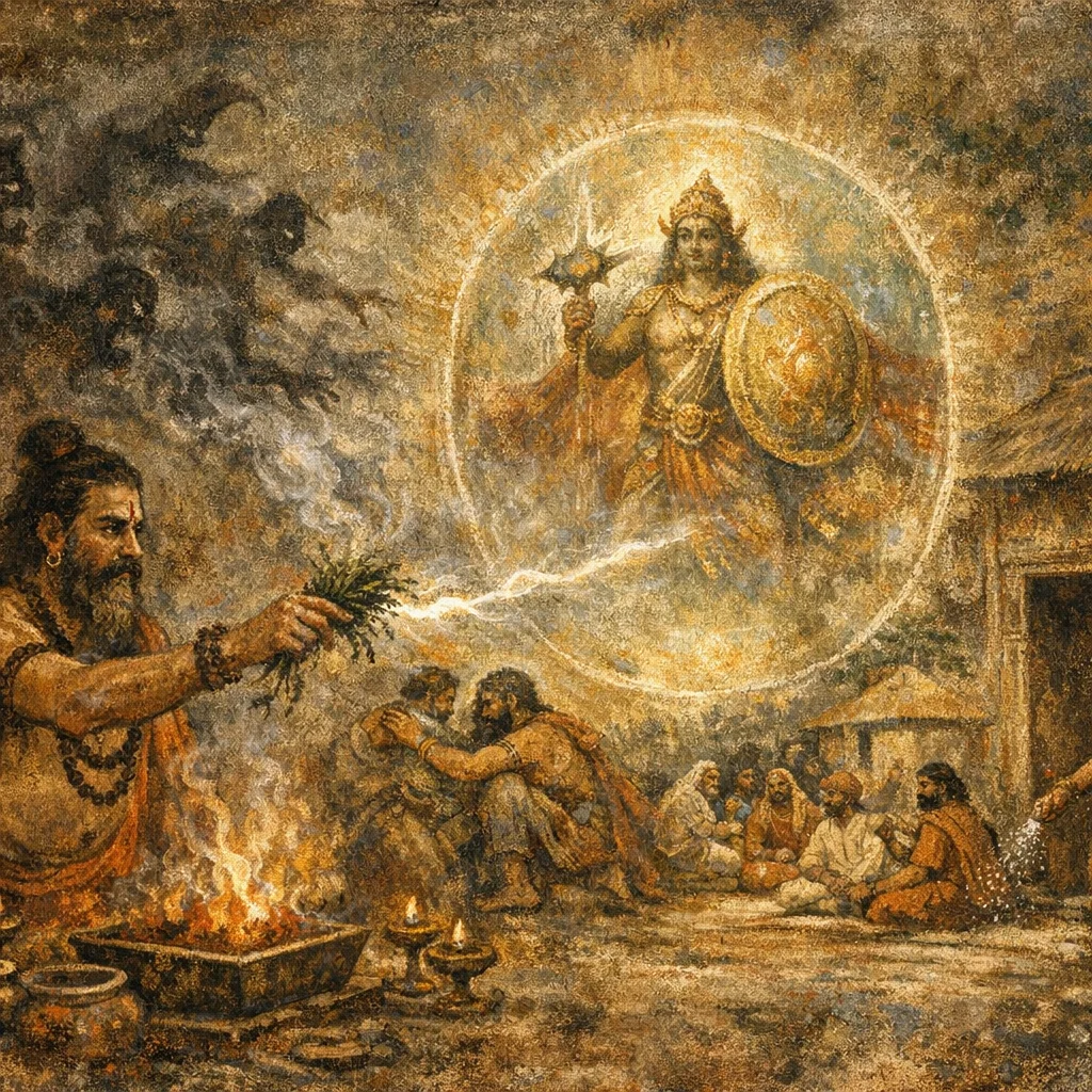 Vṛtrahan means “slayer of Vṛtra,” the power of obstruction. The title signals Indra’s ability to break what blocks success—whether enemies, impediments, or hostile forces.