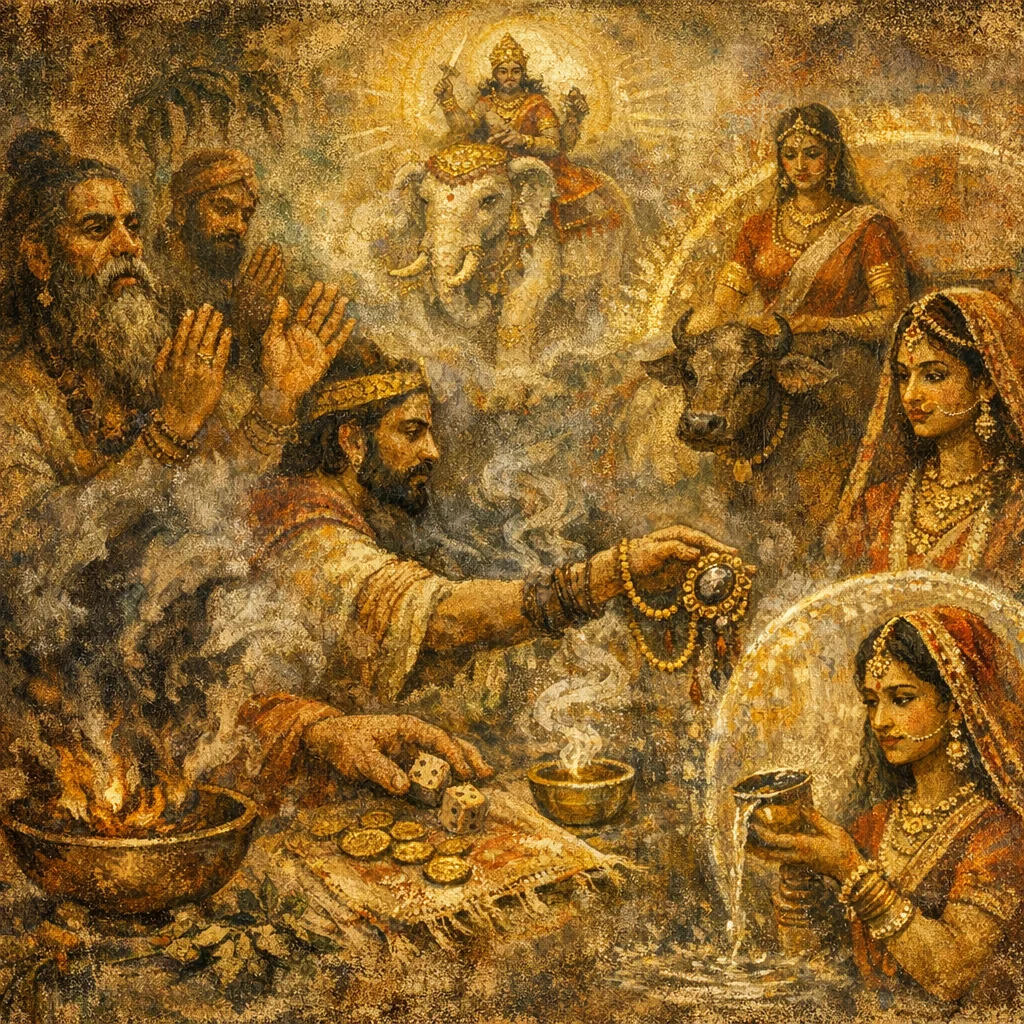 An anointing ointment, a maṇi (protective jewel/amulet), and hiraṇya (gold). These are used as visible and ritually charged markers of auspiciousness during recitation.