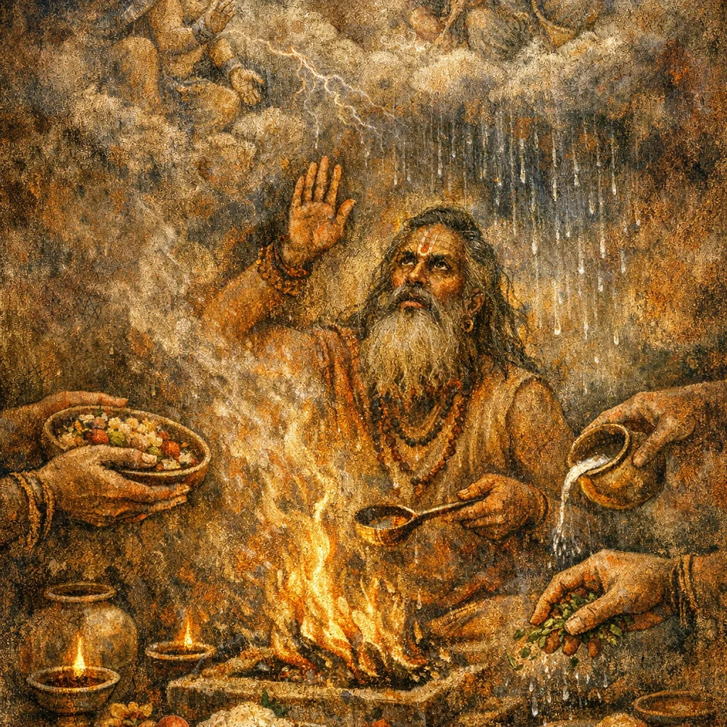 Parjanya is used as a simile: Indra’s might is compared to a rain-bearing power that nourishes and increases, emphasizing fertility and abundance as the hymn’s goal.