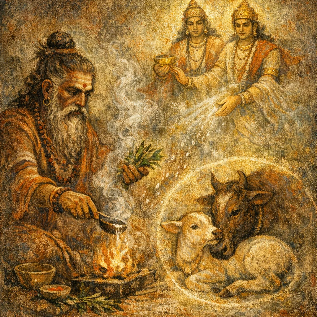 Atharvanic practice often extends protection to the whole household economy. The calf stands for vulnerable dependents and livestock well-being, integral to prosperity (paustika aims).