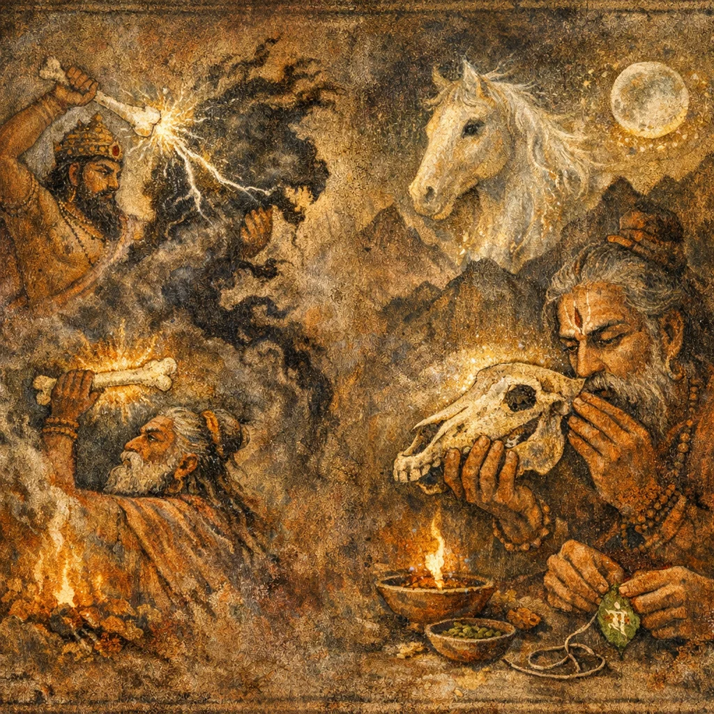 In the myth, Indra uses Dadhīci’s bones as a weapon to defeat many Vṛtras; ritually, this turns sacred substance into a symbol of irresistible force that the practitioner seeks to inherit through recitation.