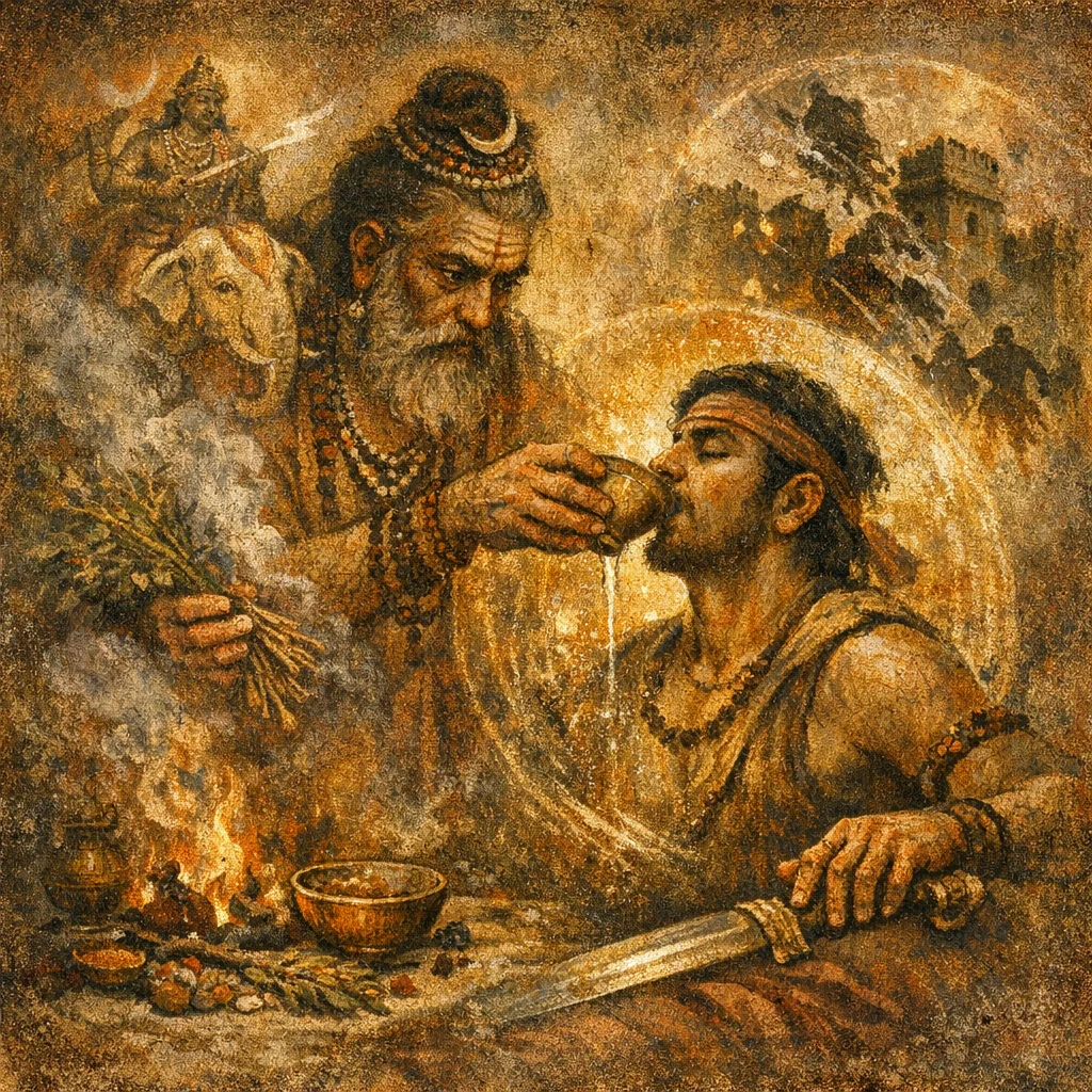 The hymn’s imagery is Soma-centered, but later practice often uses a respectful substitute libation. The key is the logic of the verses: praise + ‘pressed Soma’ context = Indra’s heightened, unhindered arrival and obstacle-breaking power.