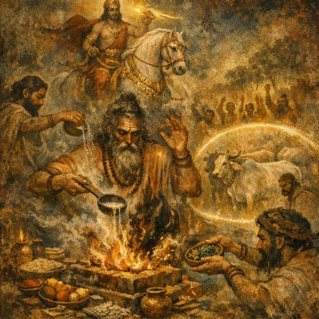 In every rapture thou art our giver, of straight resolve, of herds of kine. Grasp thou together wealth abundant, hundredfold with both hands; make keen our gain, and bring hither riches.