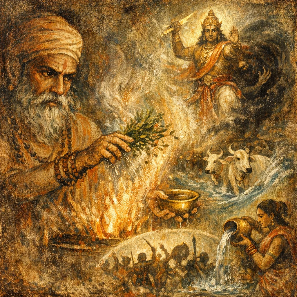 Devata: Indra (Puruhūta), with mythic associates Saramā and the Aṅgirases