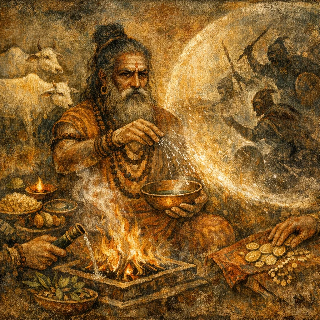 The final verse invites Indra as Dasyu-slayer to come to the cattle-pen (vraja) and asks him to avert harm from the household and herd through his effective powers (śacī).