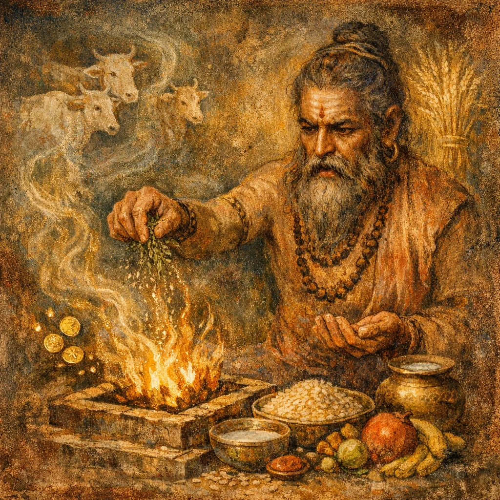 No specific herbs or amulets are indicated; the practical ritual focus is the properly established fire (Agni) and the directed intention that the assembly be well-minded and generous.