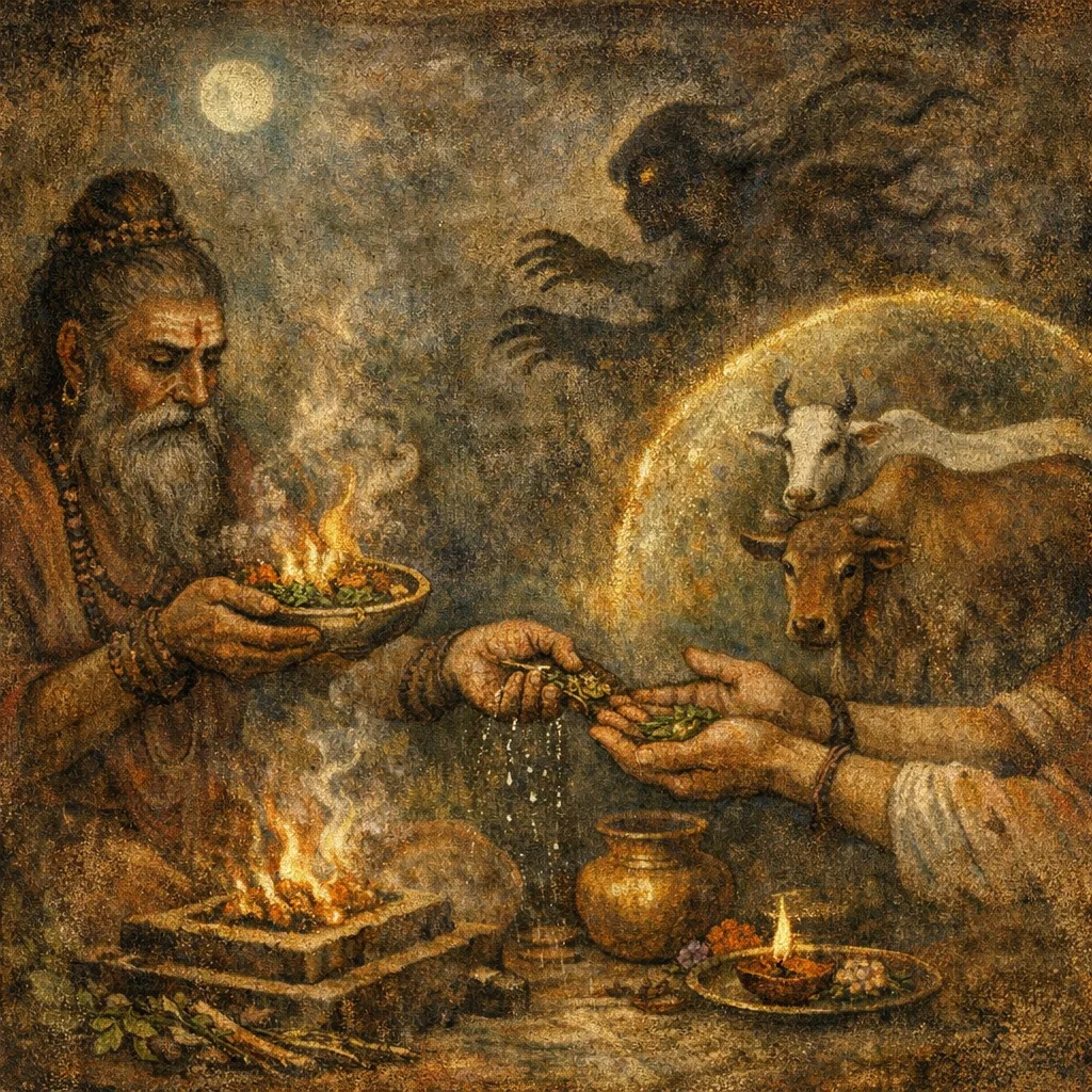 It is used to bring prosperity (Puṣṭi) and vital sap (Rasa) into one’s dwelling, cowshed, and fields, with the practical goal of increasing and protecting cattle.