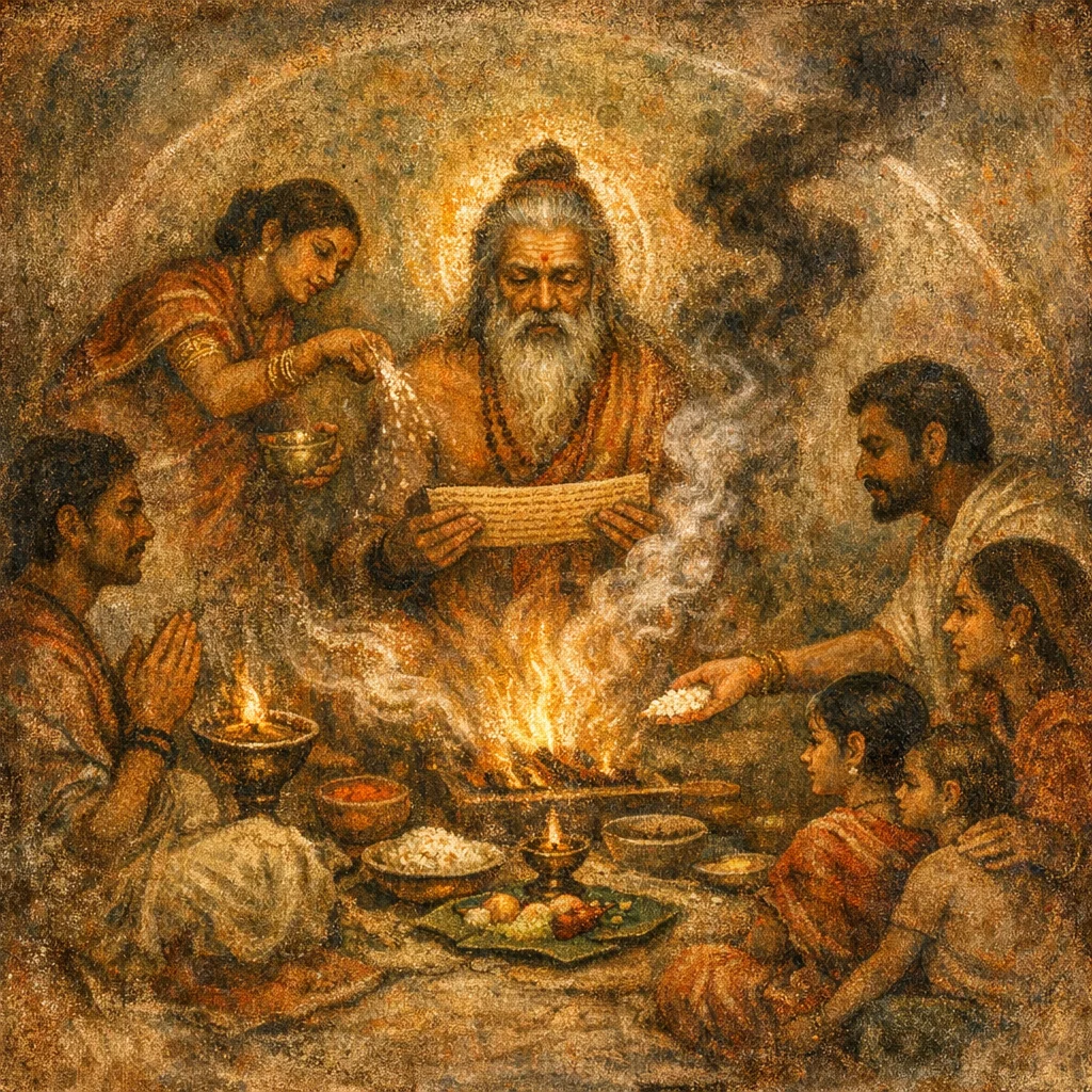 Not necessarily. The hymn works primarily through mantra as brahman ‘installed’ in the house; optional symbols (like cow–calf affection) can reinforce the intention of non-harm and warmth.