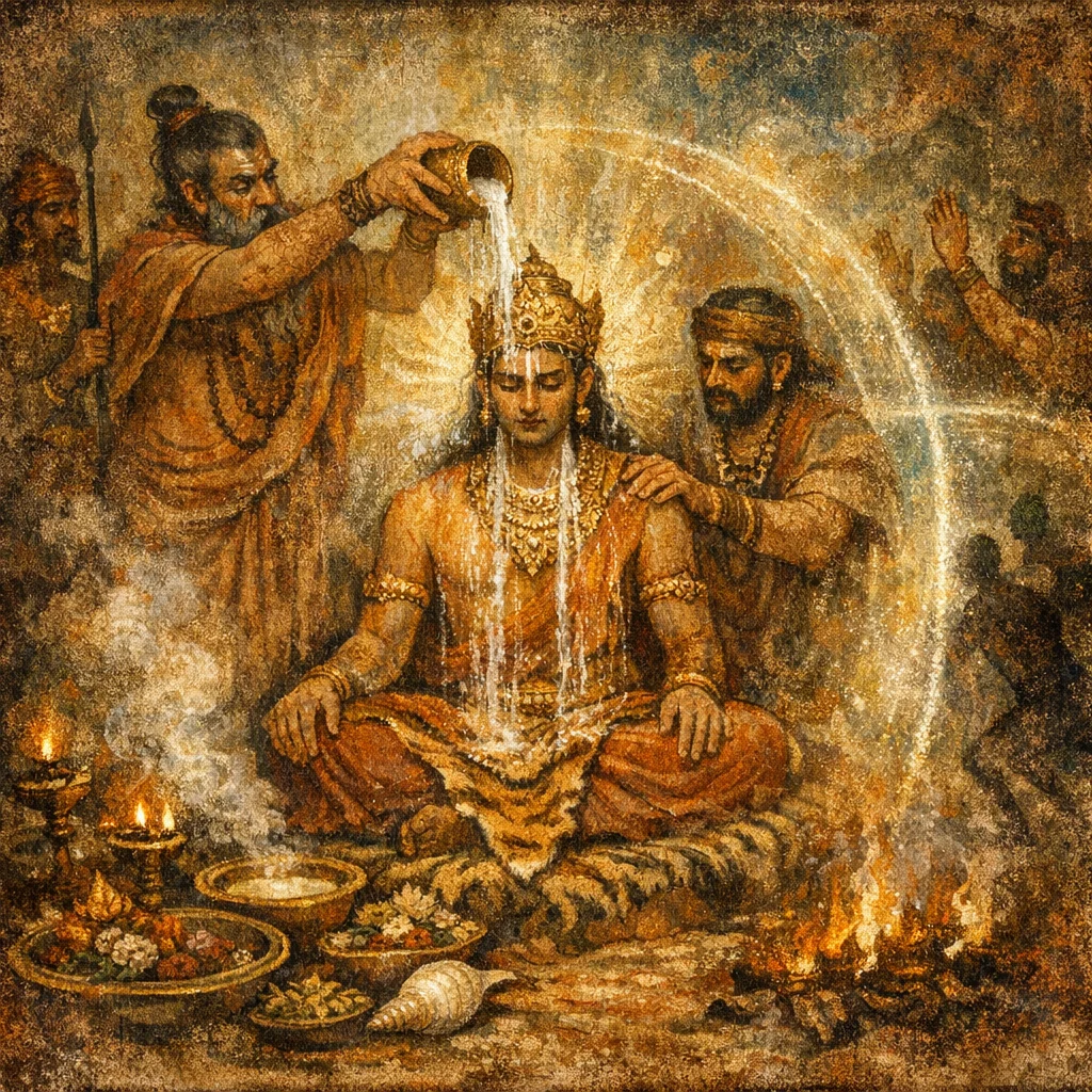 It consecrates a person—especially a king—by sprinkling empowered waters so that health, vitality, and visible lustre (vārchas) return, while prosperity and authority become socially established.