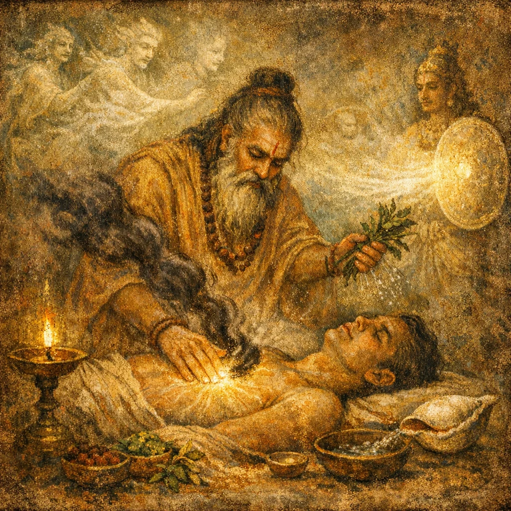 In Atharvanic healing, illness can be treated as both a physical affliction and a sign of moral/ritual disturbance; the hymn therefore asks the Gods to restore life while also releasing the underlying taint or fault.