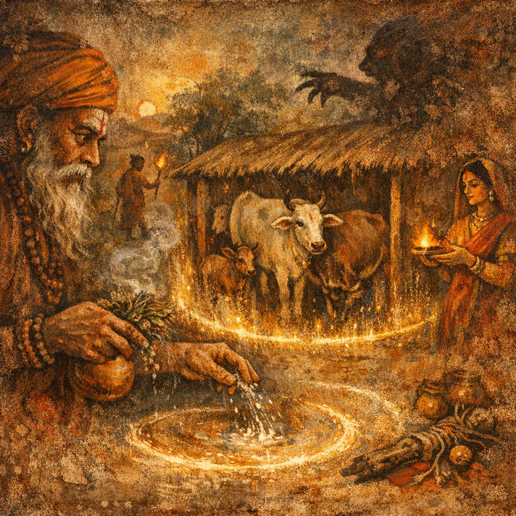 The hymn’s primary ‘materials’ are practical and symbolic: the goṣṭha (stall), good pasture, and clean water. The main protective element is the mantra-informed boundary—recited while settling the herd and encircling them in intention.