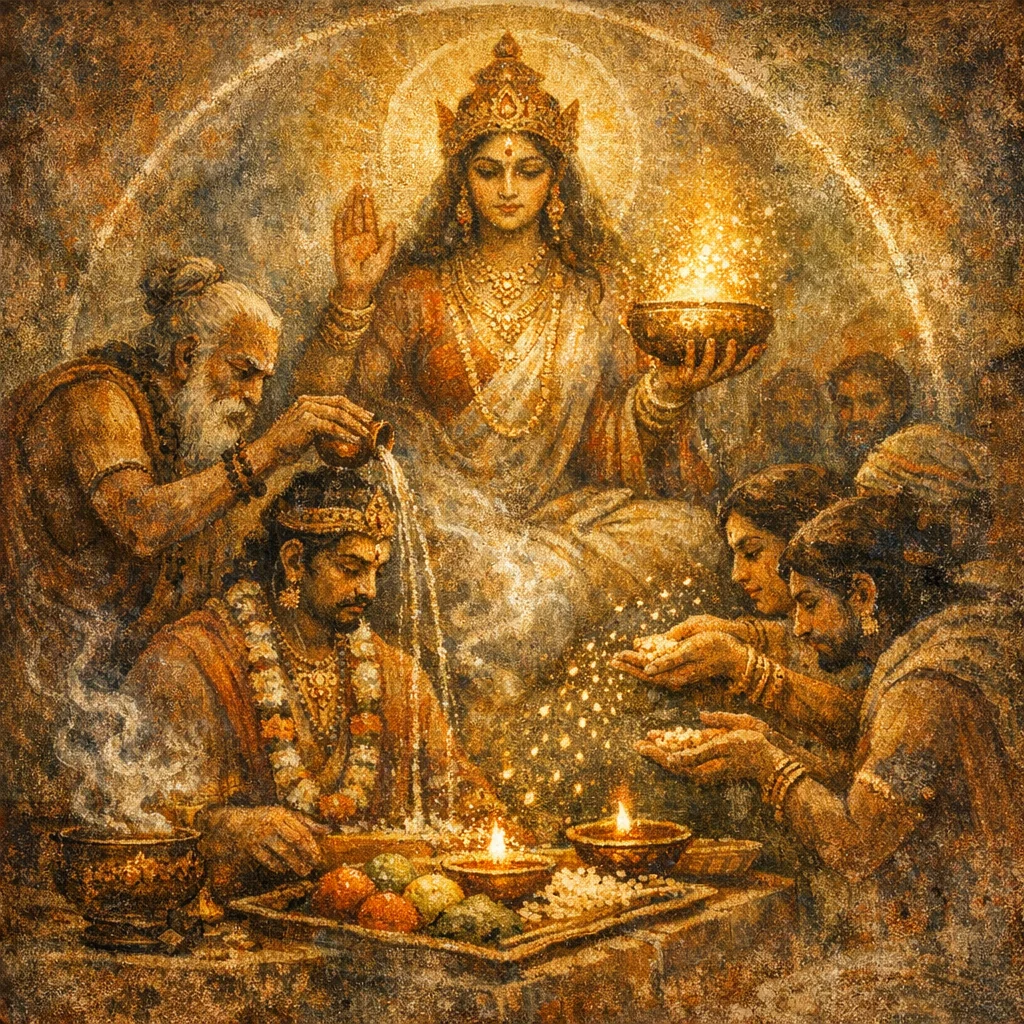 Rāṣṭrī is the personified power of the realm—sovereignty, unity, and orderly governance. In AV 4.30 she speaks as the force that supports the gods and therefore stabilizes society.