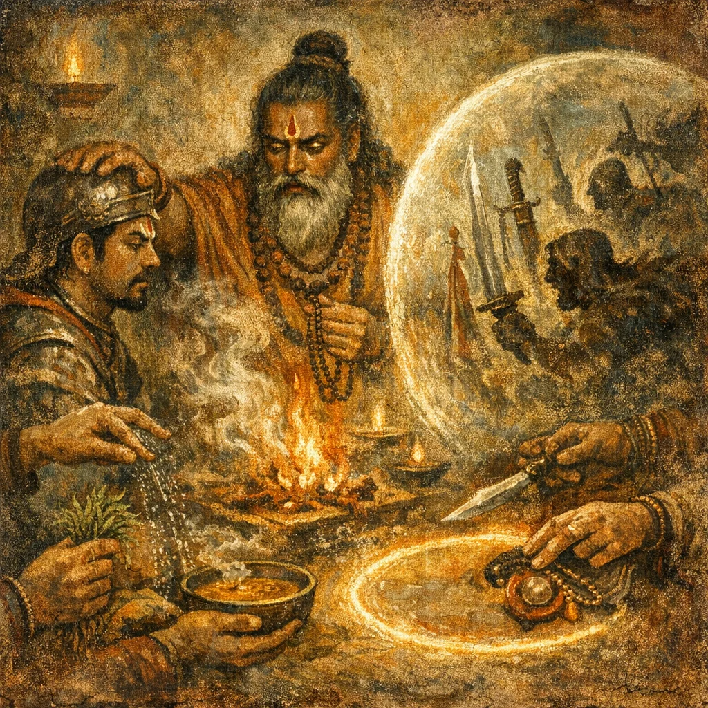 Its primary Atharvanic use is abhicārika—subduing hostile forces and enemies in a martial/protective frame. Traditional framing emphasizes defense, vigilance, and the restoration of safety and rightful strength for the patron.