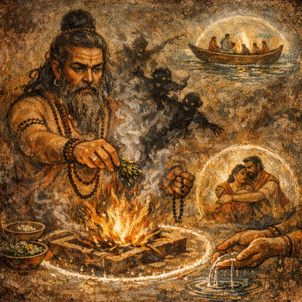 It is naturally paired with kindling a fire: recite while establishing a steady flame, directing the refrain as an expulsion formula. It fits moments of purification—after bad omens, before travel, or before important rites—seeking svasti and rayi.