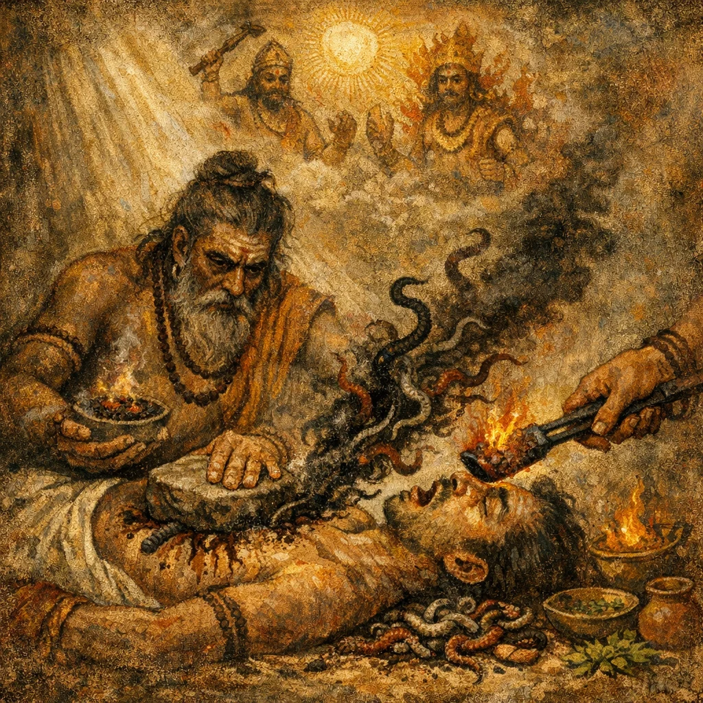 The hymn’s core operation is mantric—protection plus extermination through speech. In practice, it may be paired with water sprinkling or a protective thread, but no specific herb is mandated by the cited verses.
