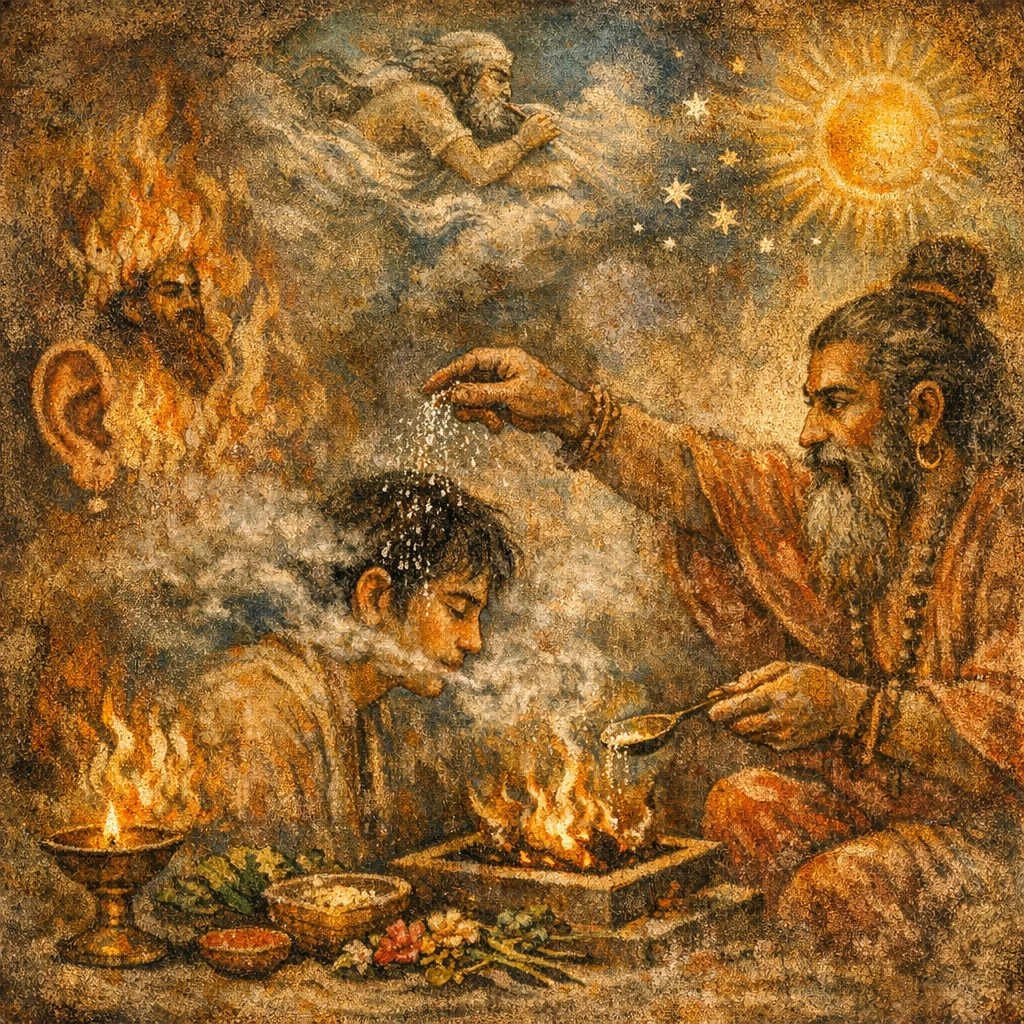Devata: Pṛthivī; Śrotra (personified); Vanaspati; Agni (Adhipati)