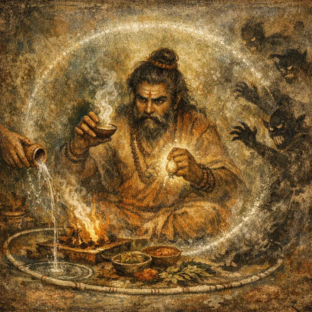 Traditionally Soma is the enabling offering, but many Atharvanic settings allow a consecrated substitute drink; the key is the intention of ‘pressing/purifying’ and the focused recitation.