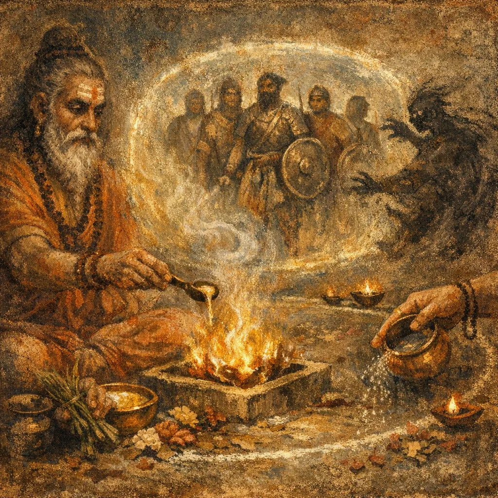 In Atharvanic protection practice, naming feared powers can ‘bind’ and redirect them. The hymn treats them as controlled guardians, compelled to stand watch and keep harm outside the boundary.