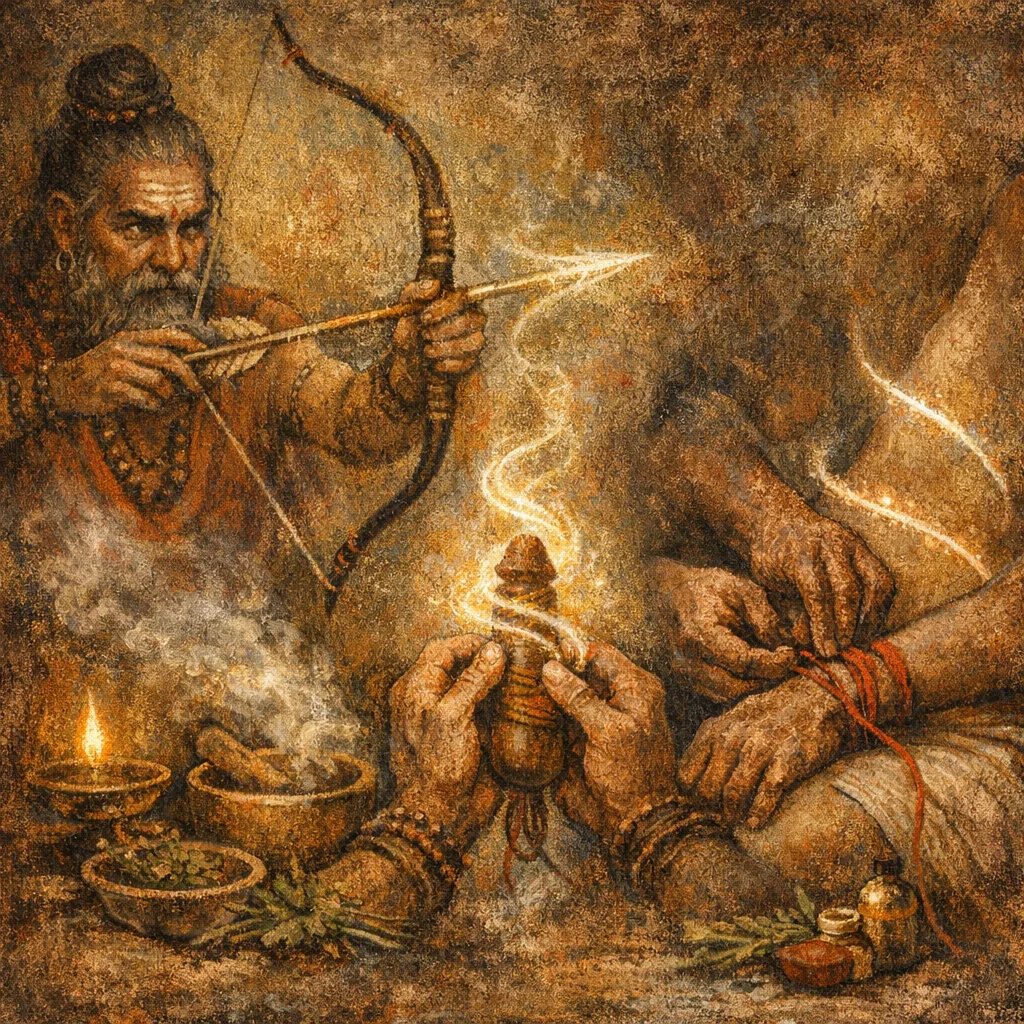The bowstring image ritualizes ‘tautness’: the mantra is imagined to tighten and stabilize potency the way a string is drawn tight on a bow—firm, directed, and not slack.