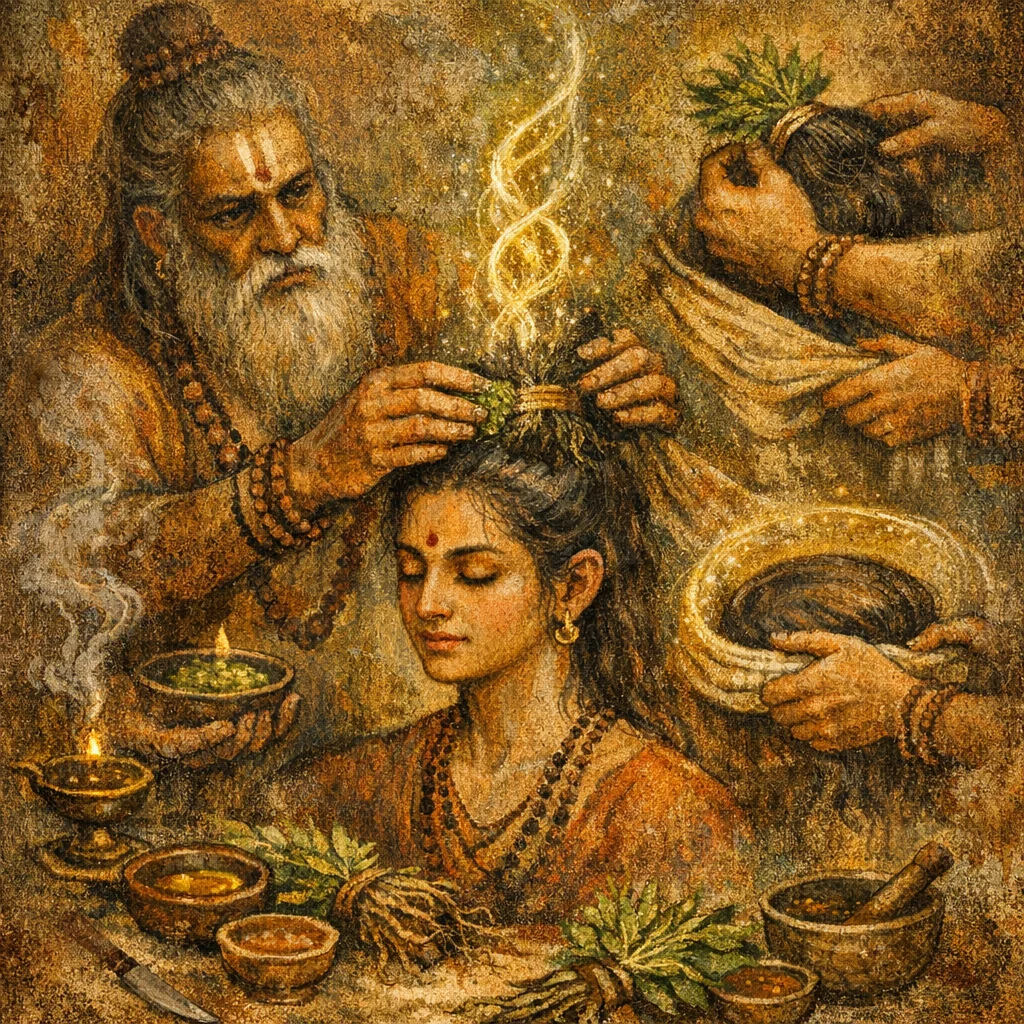 It asks—and commands—that hair grow thick and evenly like reeds, become dark and abundant, and remain strong: rooted firmly, not breaking at the ends, and lengthening well in the middle.