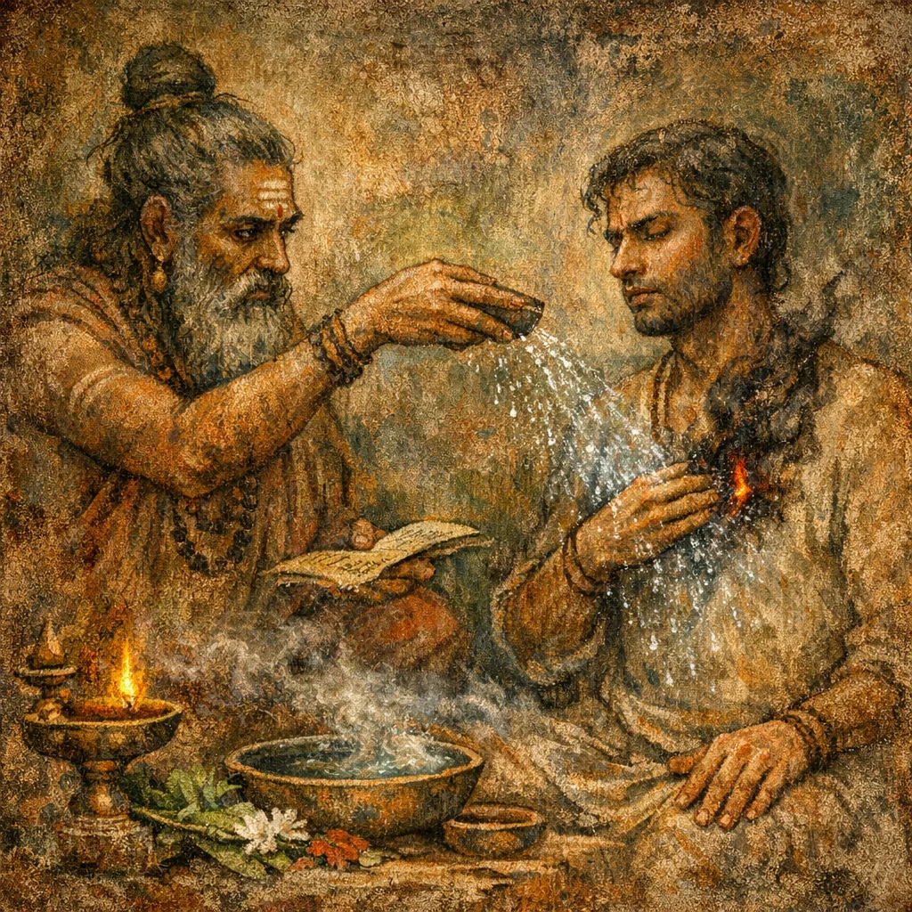 Agni here functions as a metaphor for the heart’s heat—burning grief and agitation. The mantra’s action is ‘nirvāpa’ (quenching), turning emotional fire into calm.