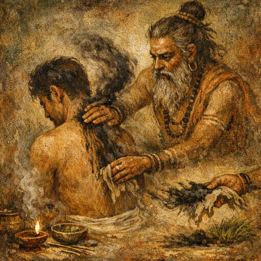 The verses themselves prescribe no medicine; the primary instrument is the spoken charm with a banishing gesture. Some traditions add washing or a simple protective thread, but these are optional supports.