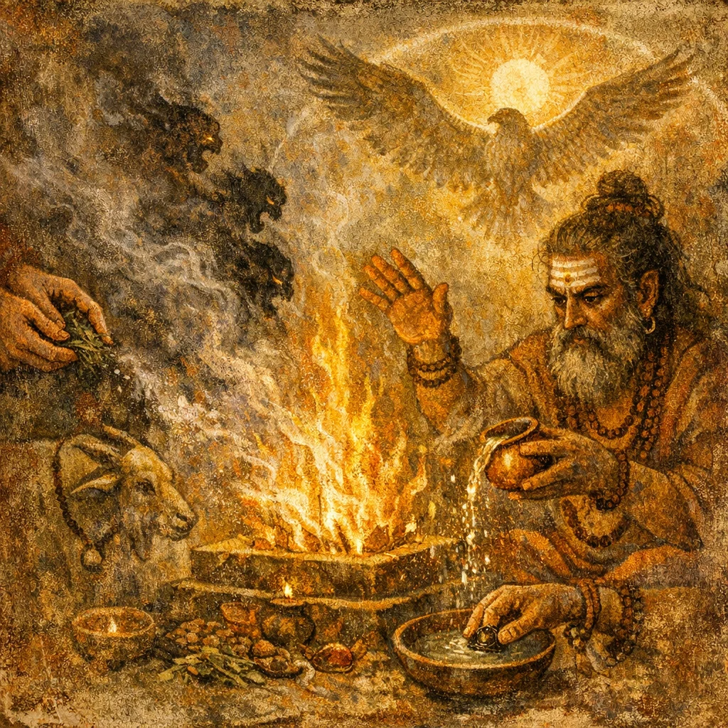The core materials are a clean fire and clean water. Optional supports include a boundary marker (doorway/cord) for the ‘exit’ and a small use of ash or ghee, depending on tradition.