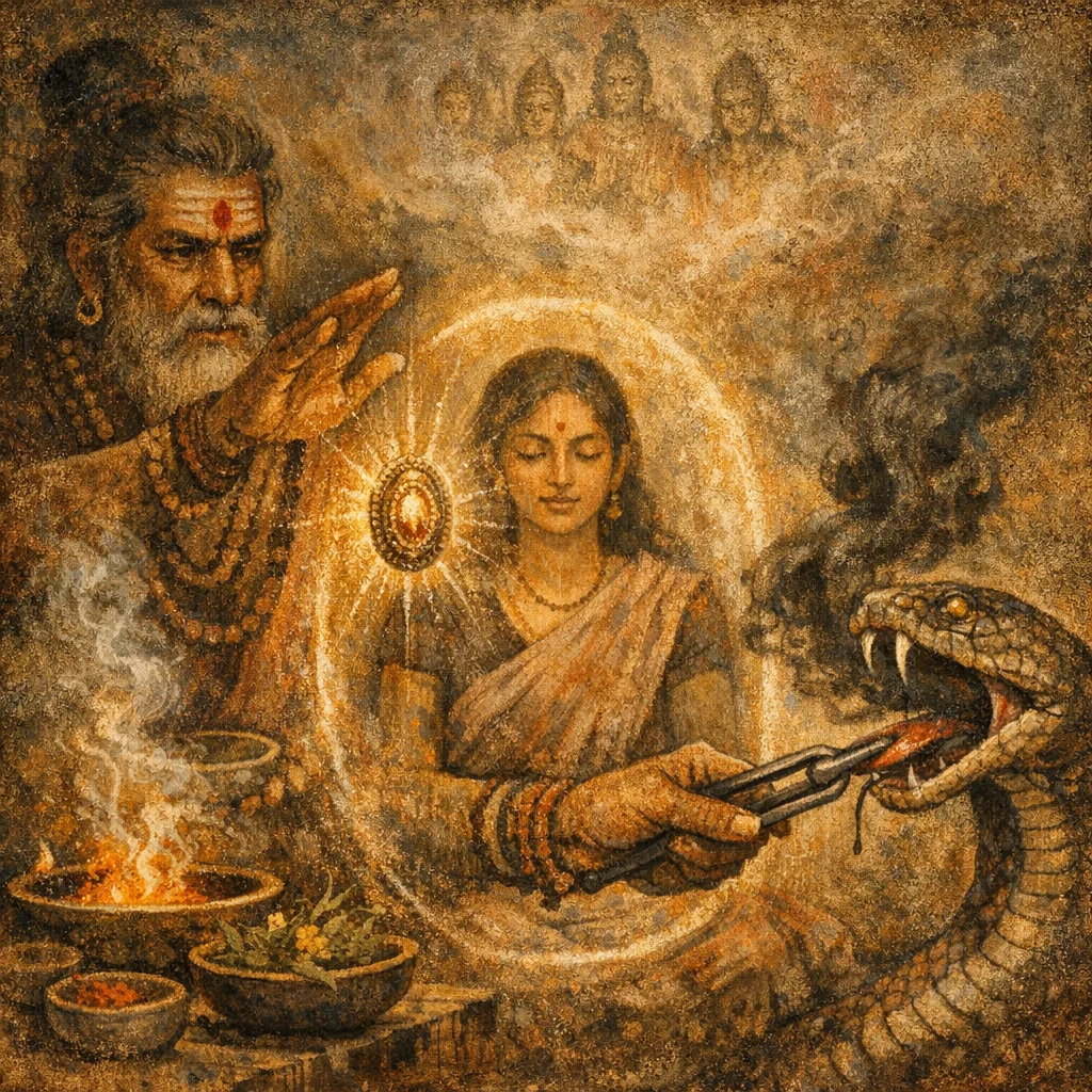 Devata: Sarpa/Ahi (serpent-kinds) addressed through propitiation; gods invoked as restrainers